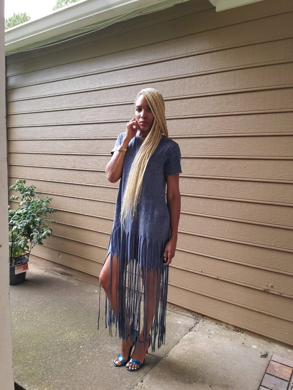 Stone washed blue vintage T-shirt dress with fringes on the hemline. Super comfy.